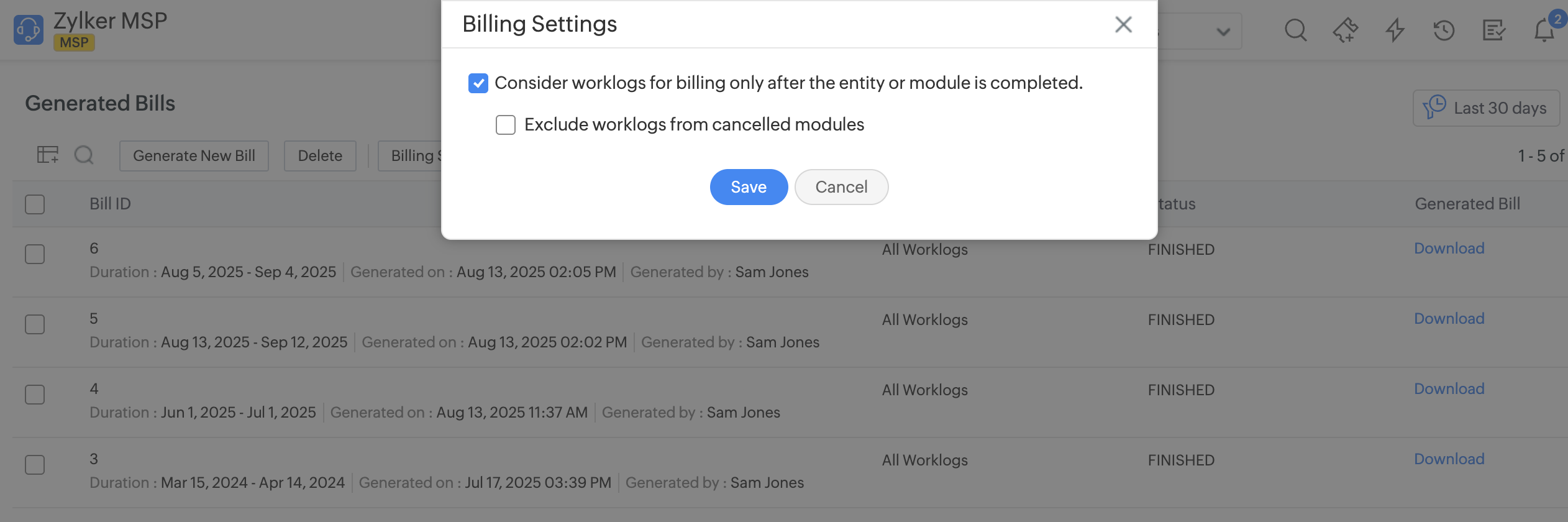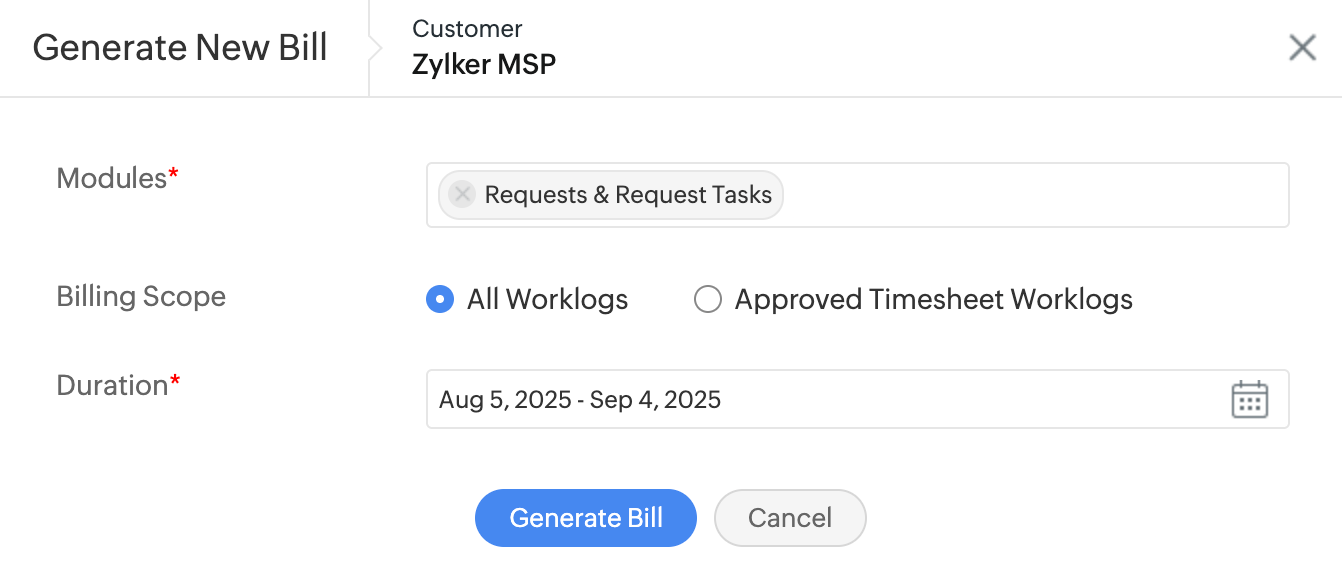 All Worklogs: Generate bill for all work log entries within the selected module.