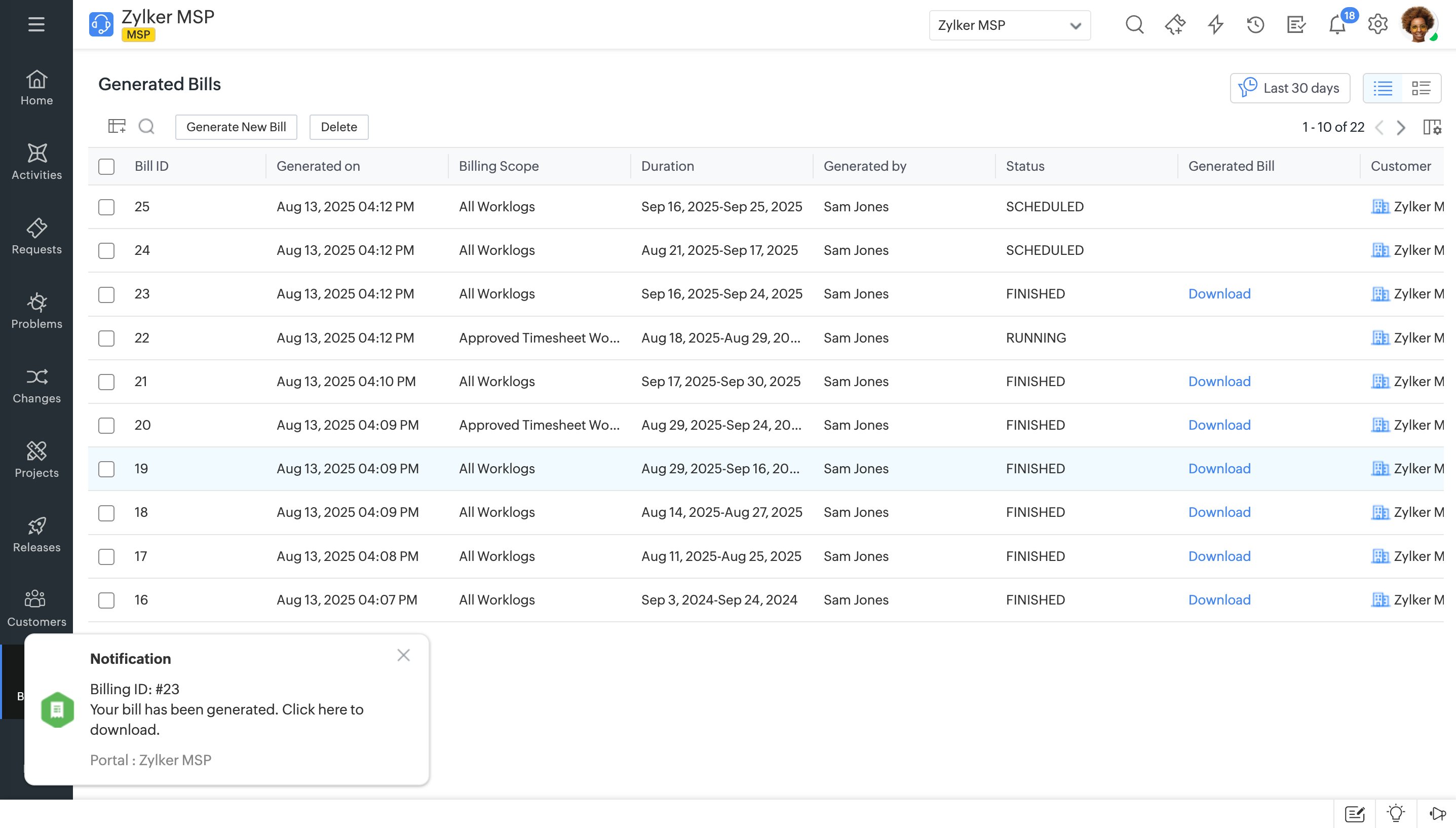 After the background job finishes, the status changes to FINISHED, and you will receive a push notification. You can download the generated bill by clicking the notification or by clicking Download under the Generated Bill column.