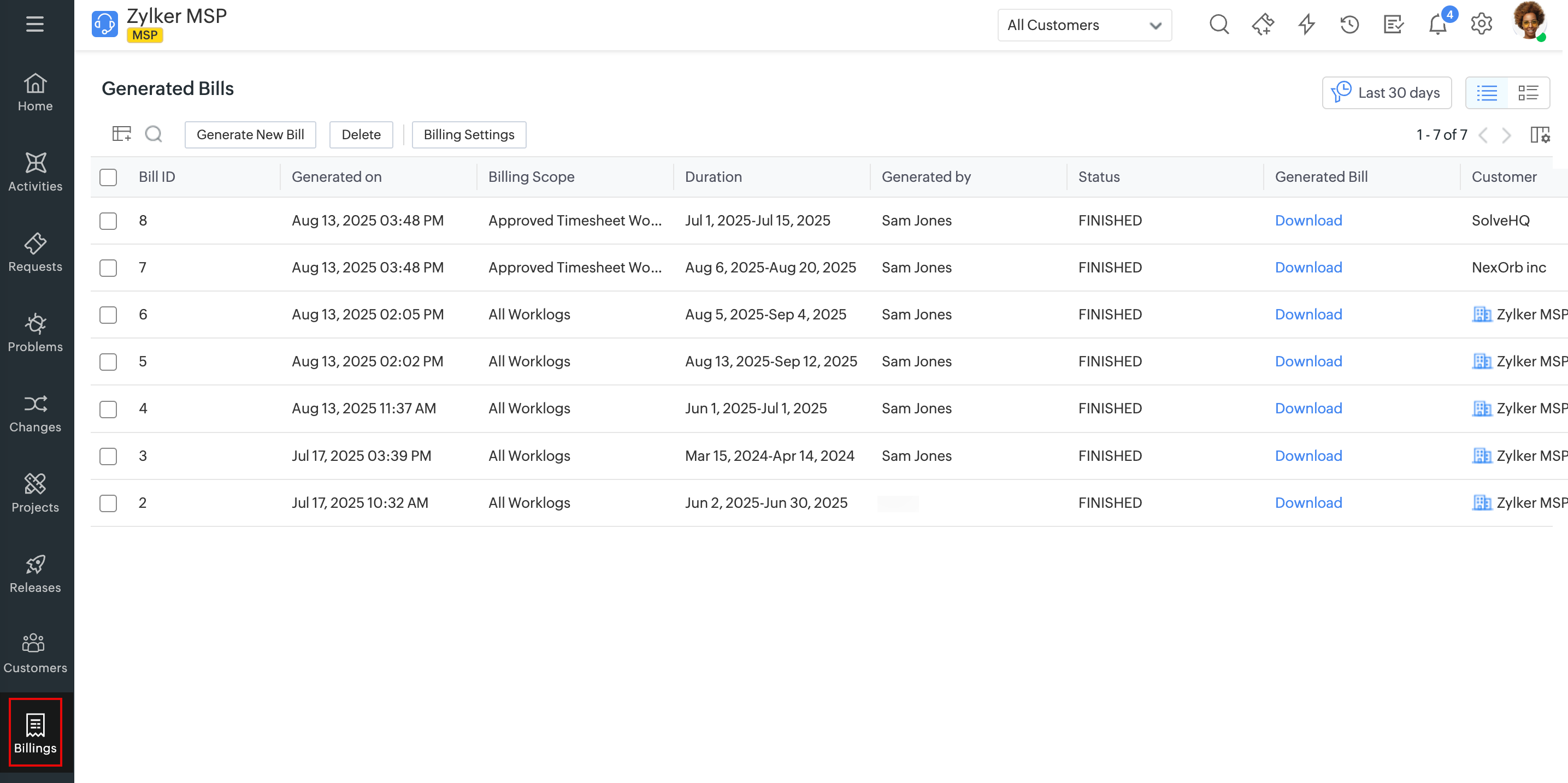 - Filter Bills: By default, bills generated from the last 30 days will be displayed. Use the time filter
