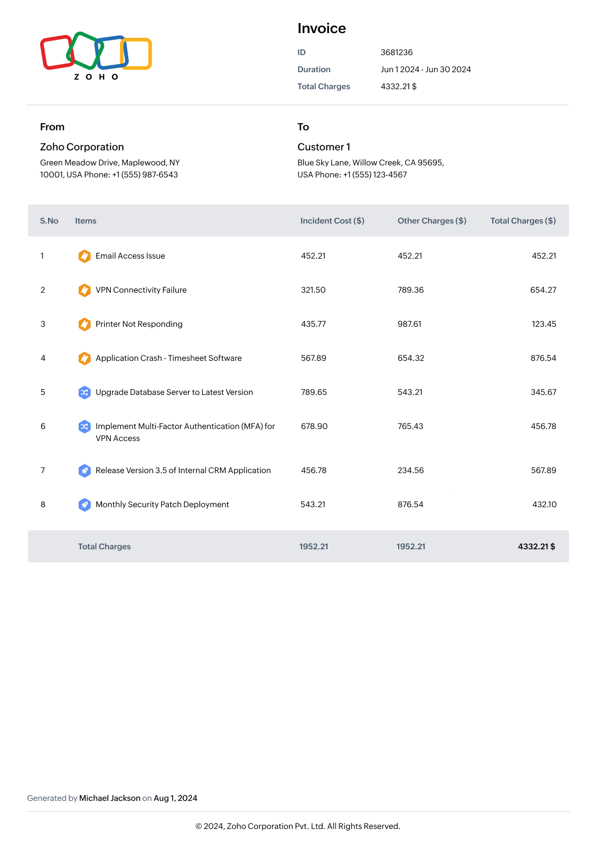 The generated bill will display the MSP’s logo, invoice details, customer name, and a table listing each item’s description and charges, followed by the total amount.