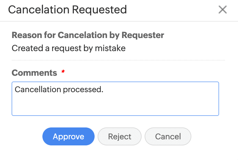 If the cancellation is approved, the request will be moved to the Canceled status. If the cancellation is rejected, the requester will be notified, and the request will resume its workflow.