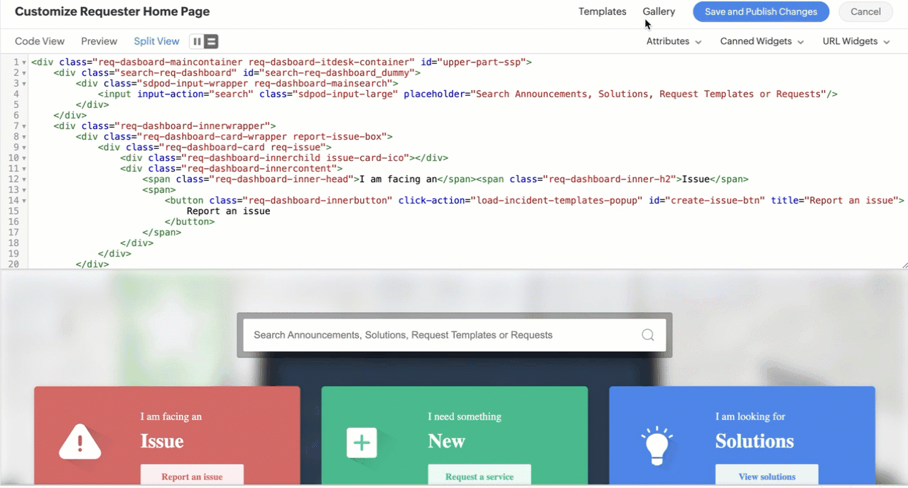 - Customize the HTML widget by using the given attributes, canned widgets, and URL widgets. Attributes allow you to provide help desk actions for requesters such as logging service and incident requests and viewing solutions, requests, changes, and projects. The available attributes are as follows.