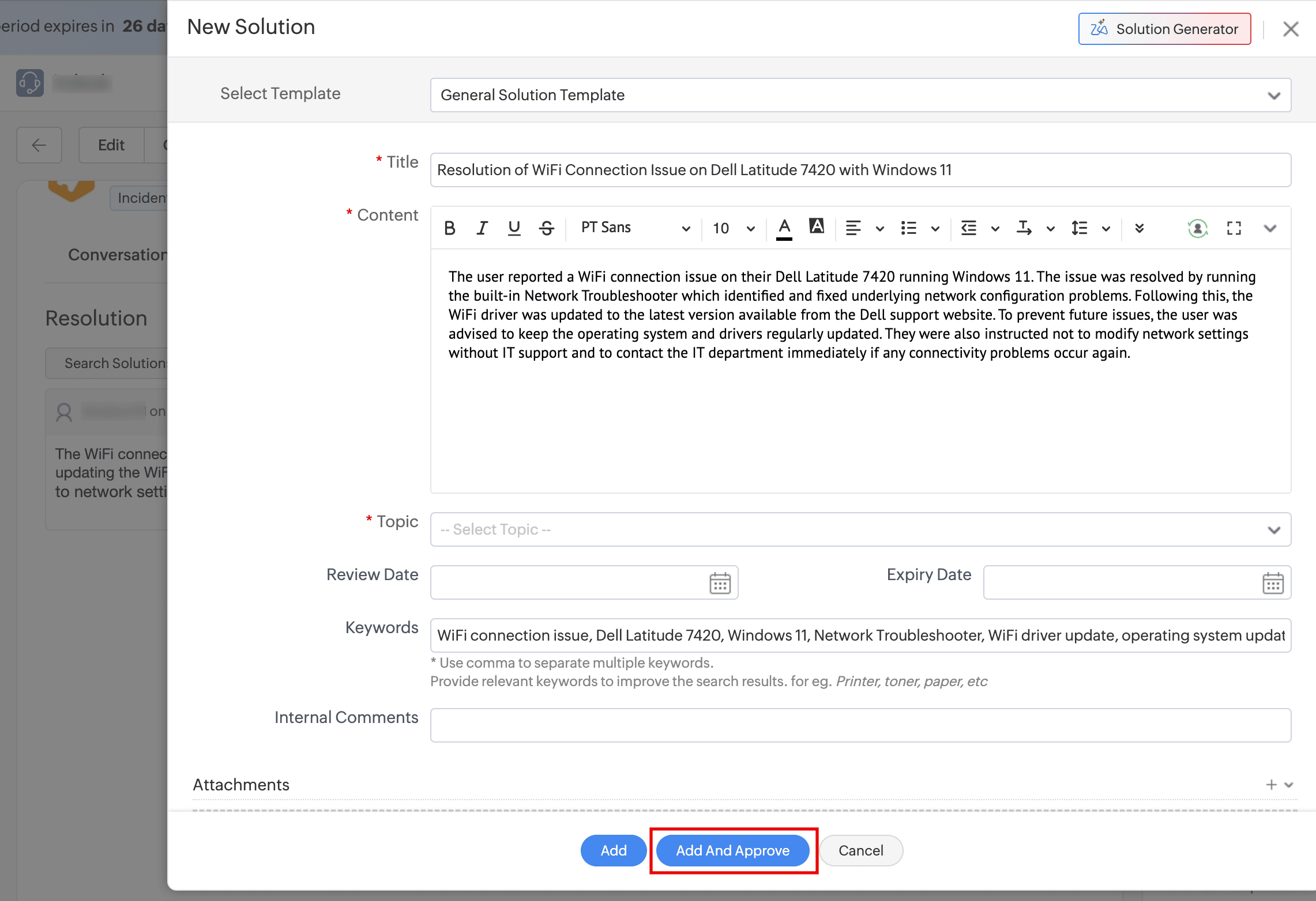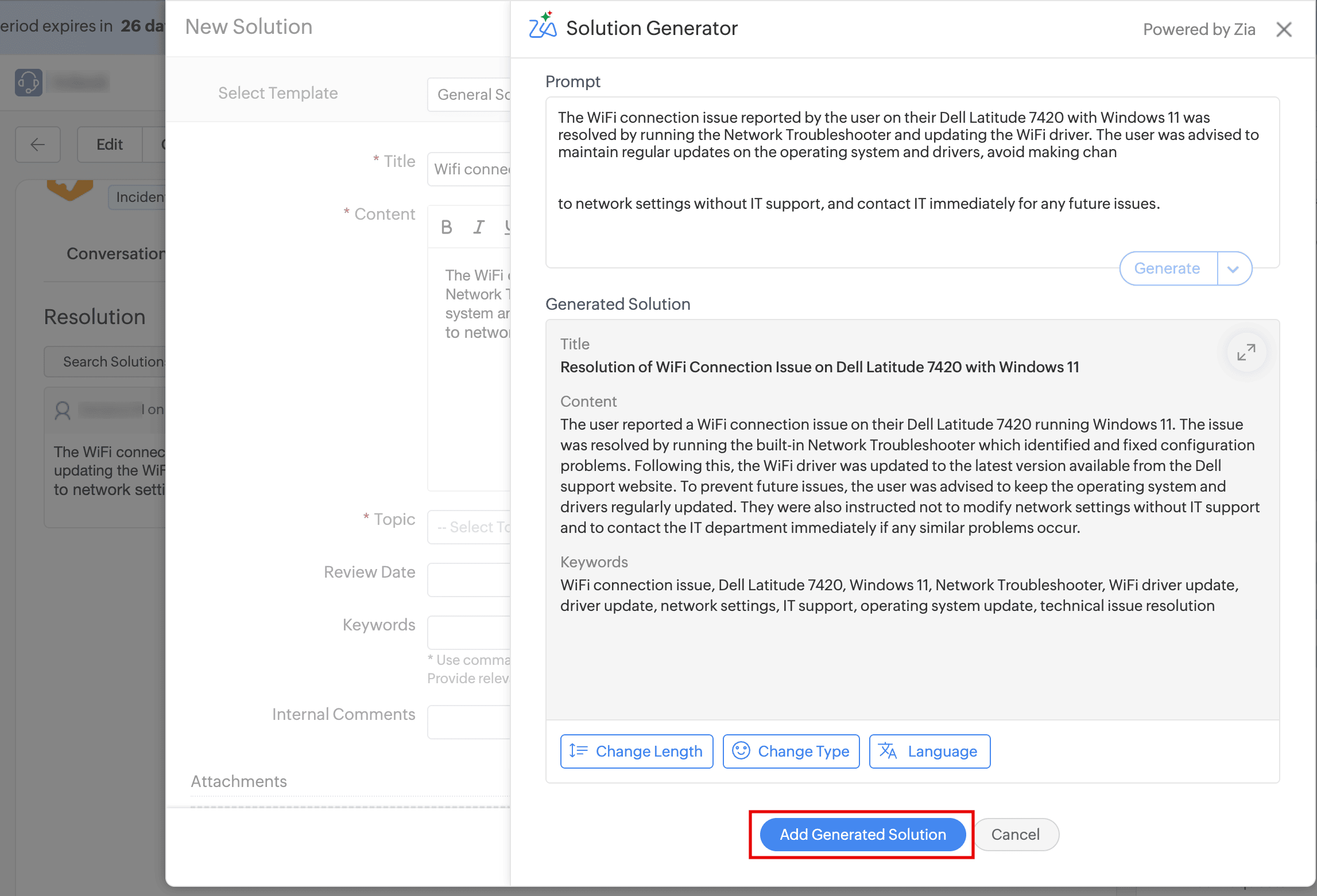 - In Prompt, provide the issue summary and click Generate. The AI provider will generate a solution with a title, description, and keywords.