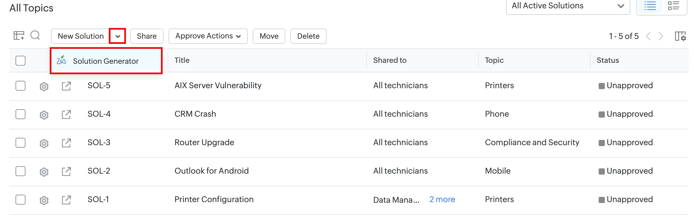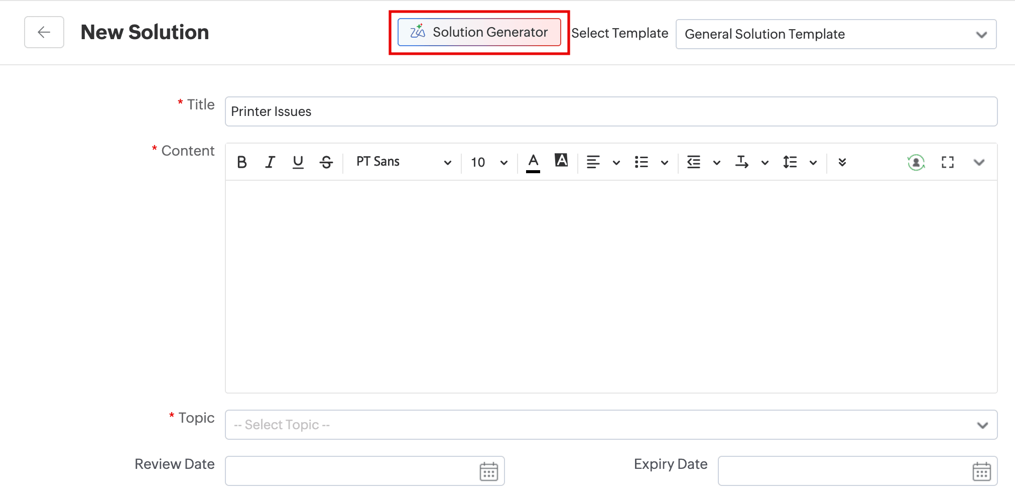 - Click the Solution Generator option in the solution list view or the add/edit solution form.