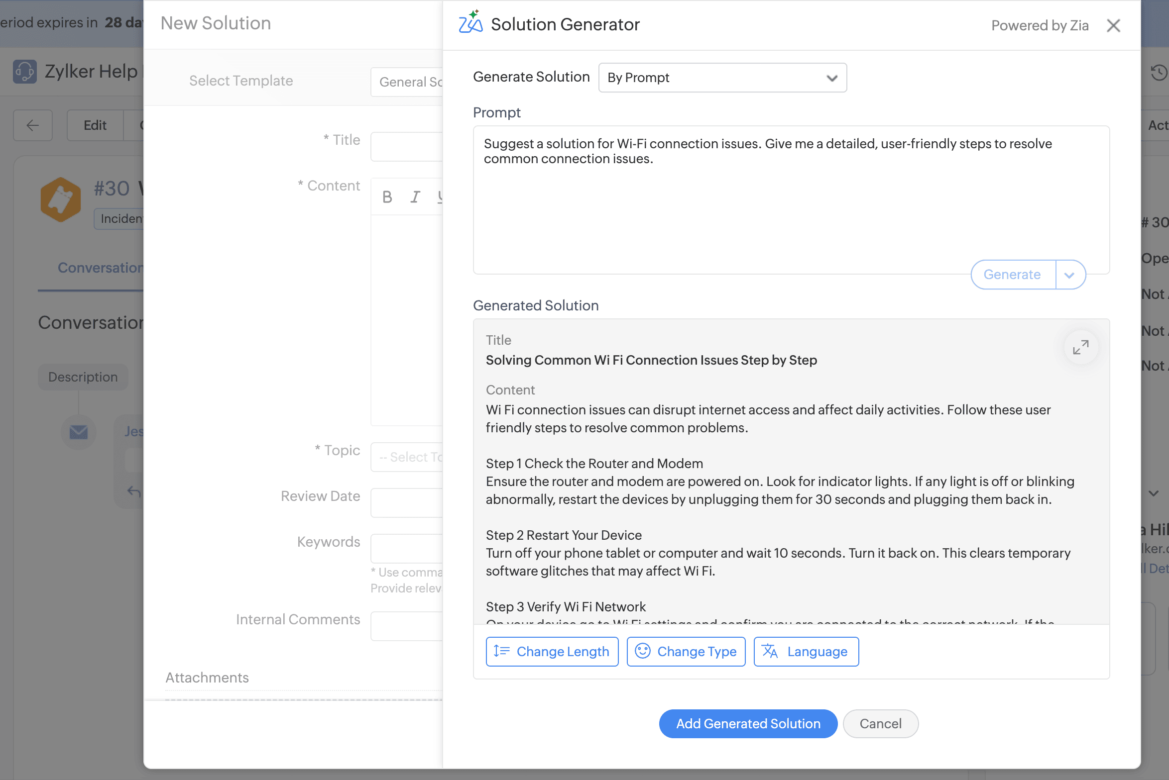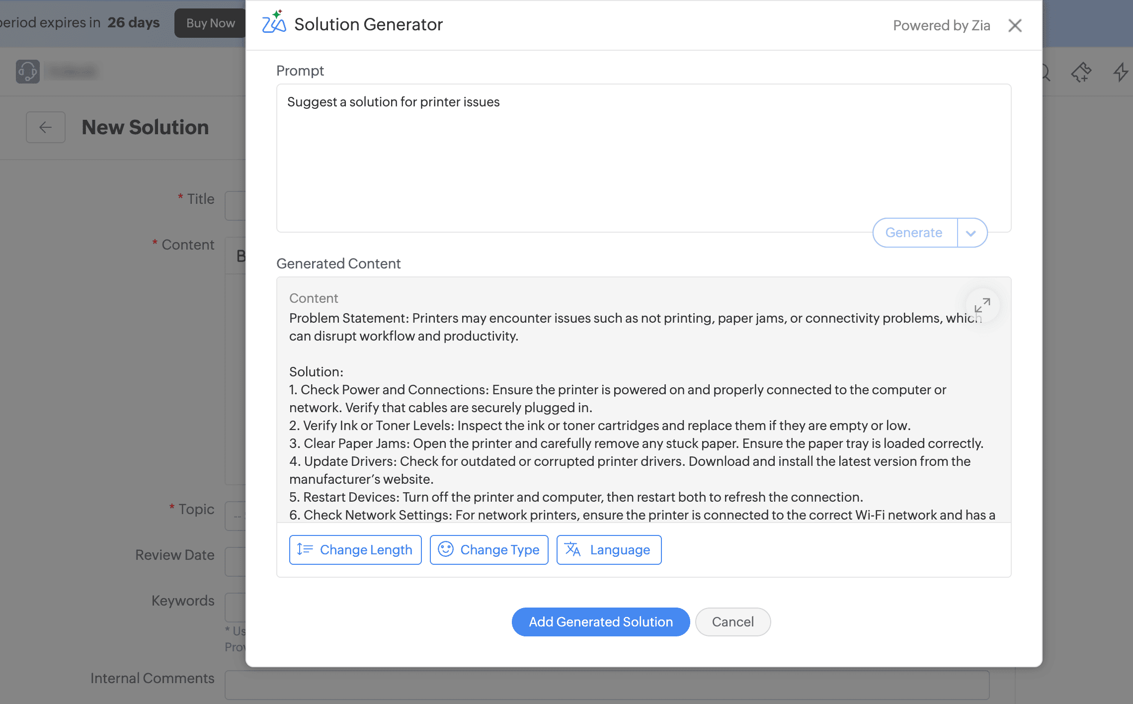 - Solution will be generated. Use relevant options to fine-tune the content by adjusting length and type and translate into your preferred language. By default, the solution is generated in the language used in the prompt.