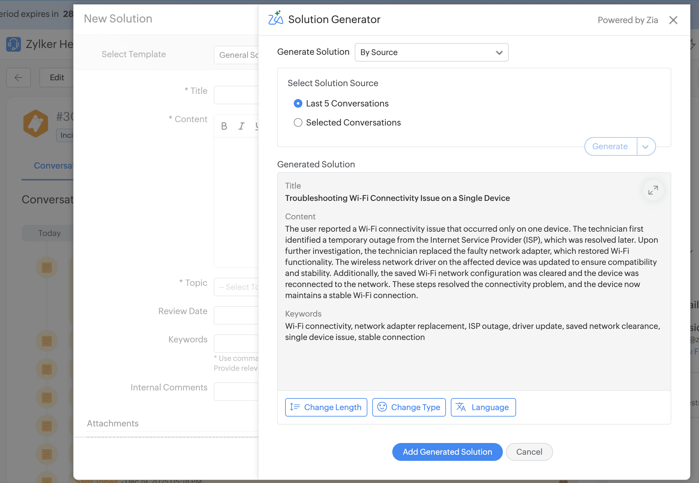 - By Source: Select this to generate a solution based on request conversations. You can choose to include the five most recent conversations or only specific conversations.
