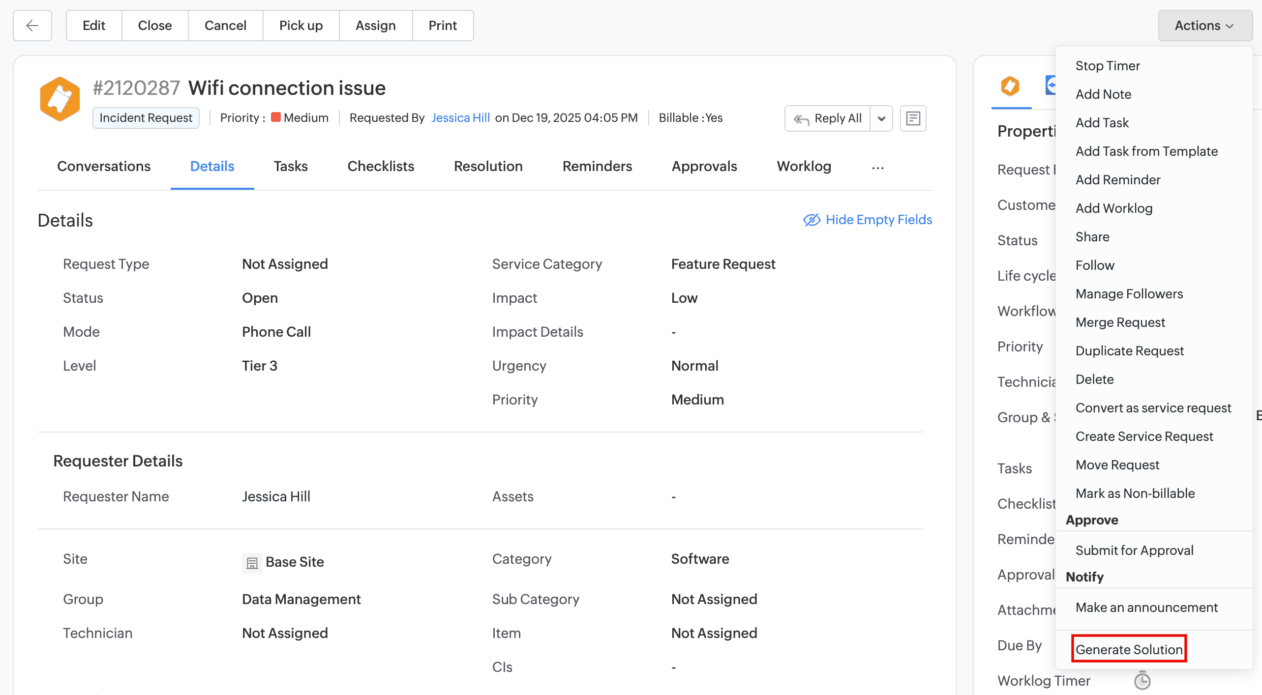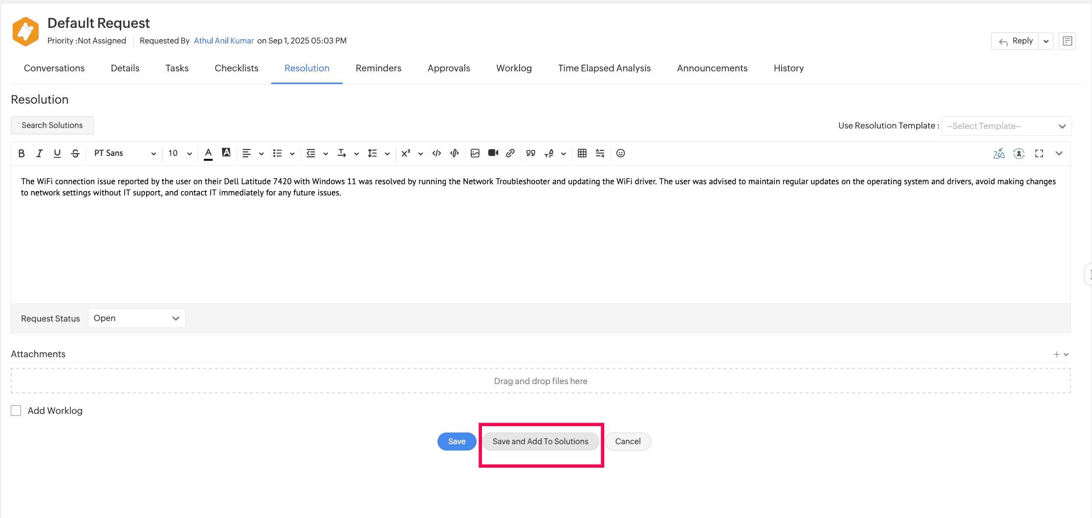 - Go to the Resolution tab on the request details page.