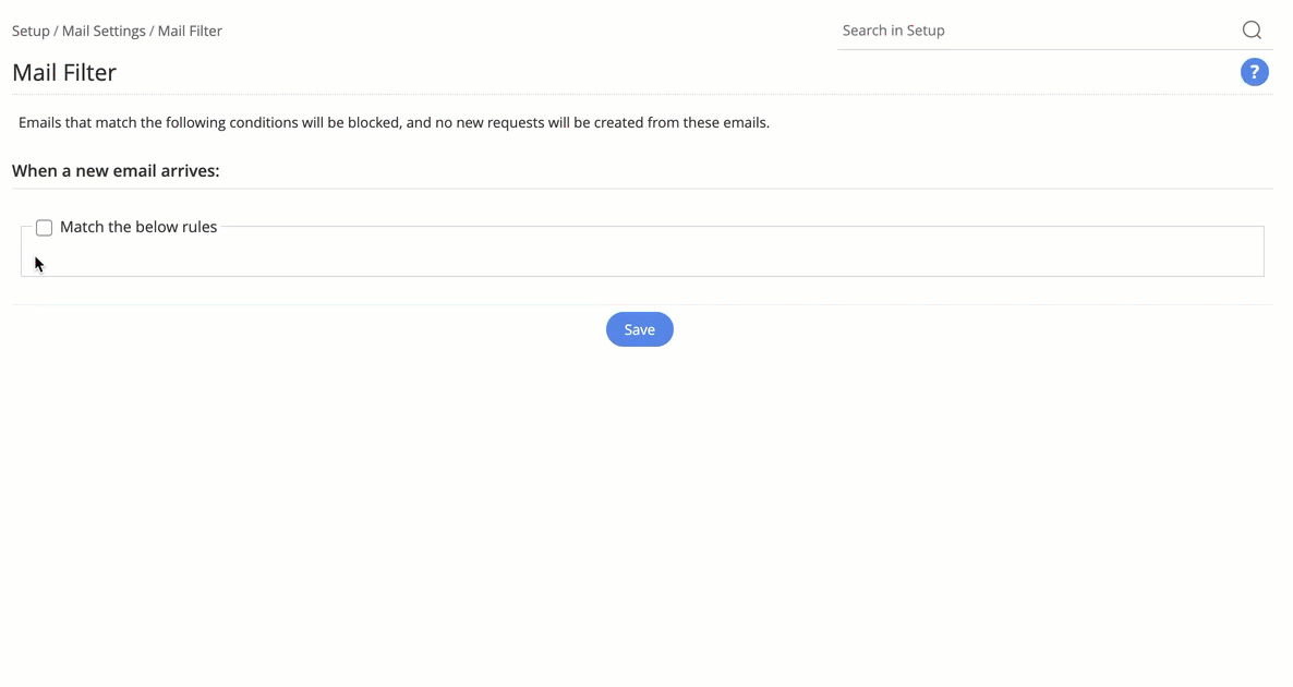 Mail Filter prevents unwanted emails from being converted into requests in ServiceDesk Plus MSP Cloud. Using mail filter, you can block unnecessary or spam emails.