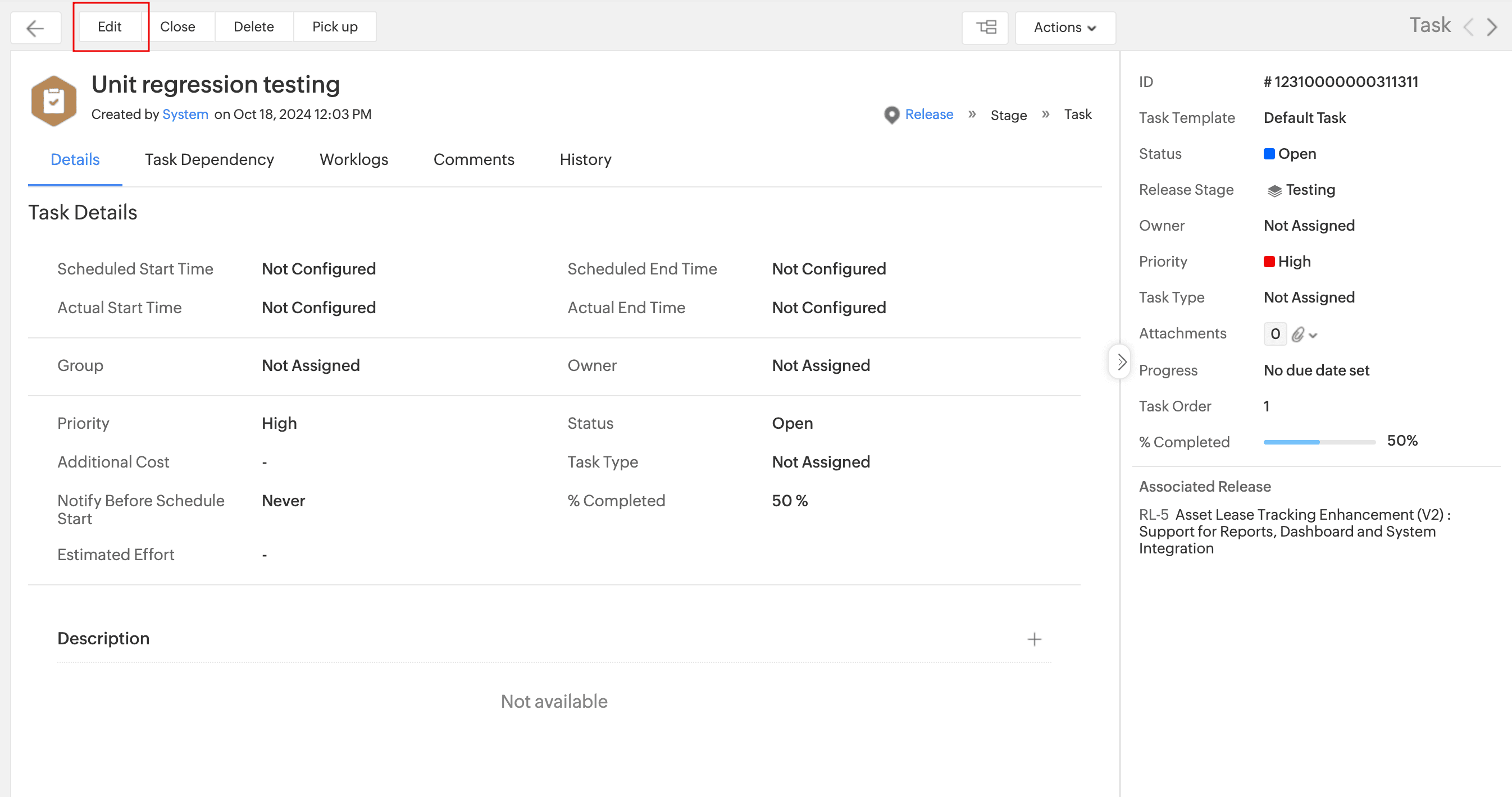 - Worklogs: Create, edit, and manage work log records related to the task. Learn more.