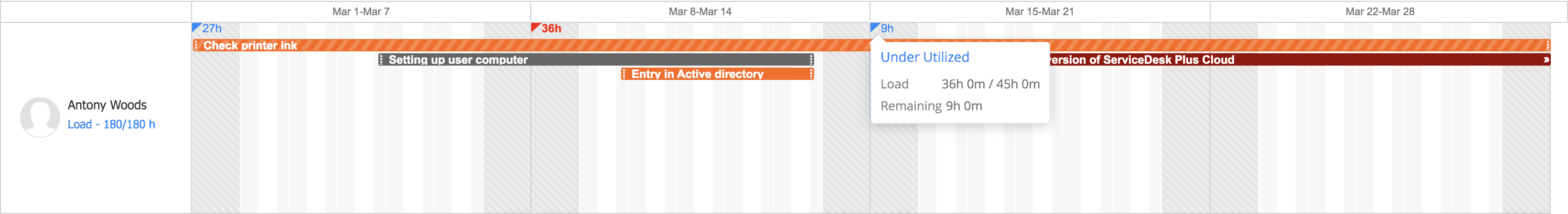 Multiple bars against a resource at the same time indicate that the resource is over-utilized. So you can allocate one of the tasks to other resources or reschedule the work. For over-utilized resources, a red badge is displayed with additional workload (overloaded hours) in the upper-left corner of the corresponding date/week. Hover over the resource to view the operational hours of that resource, total hours allocated, and additional hours allocated to that resource.