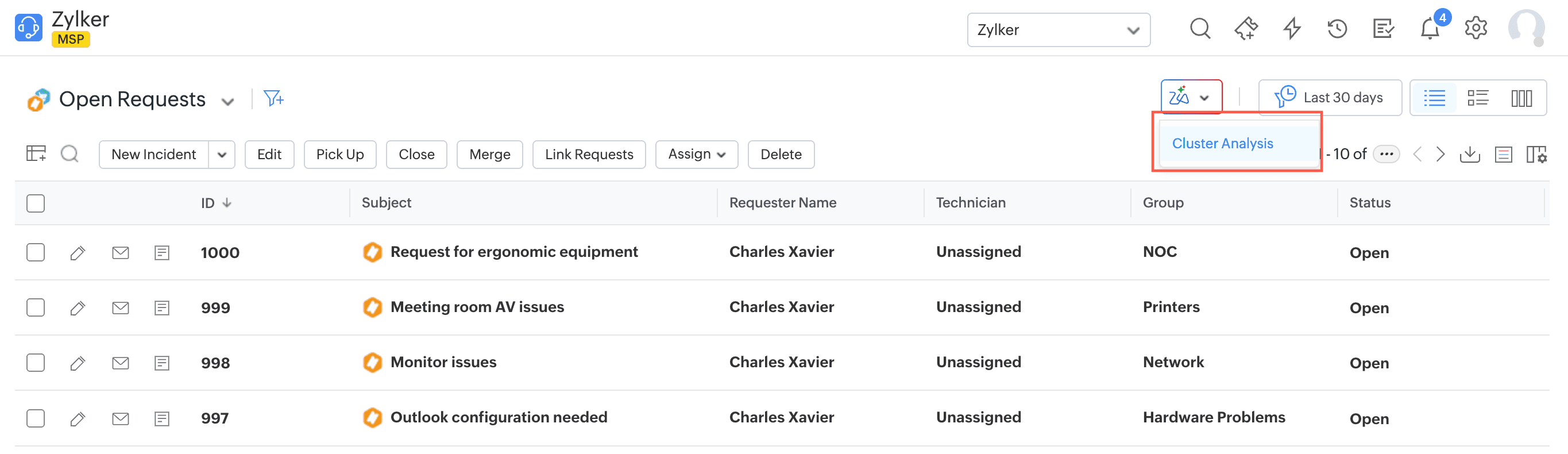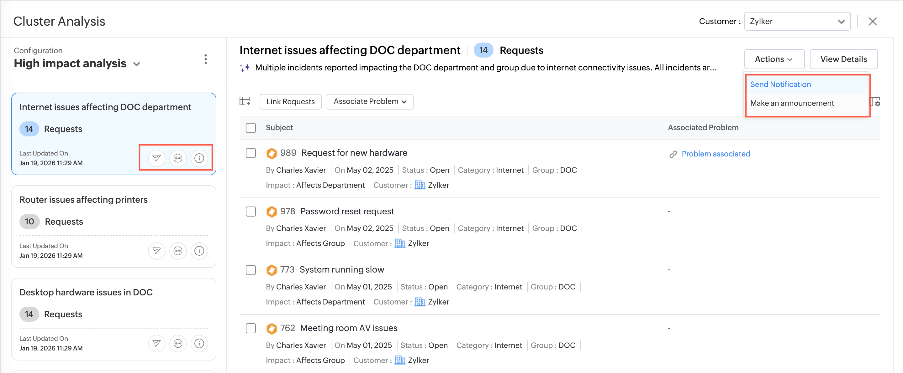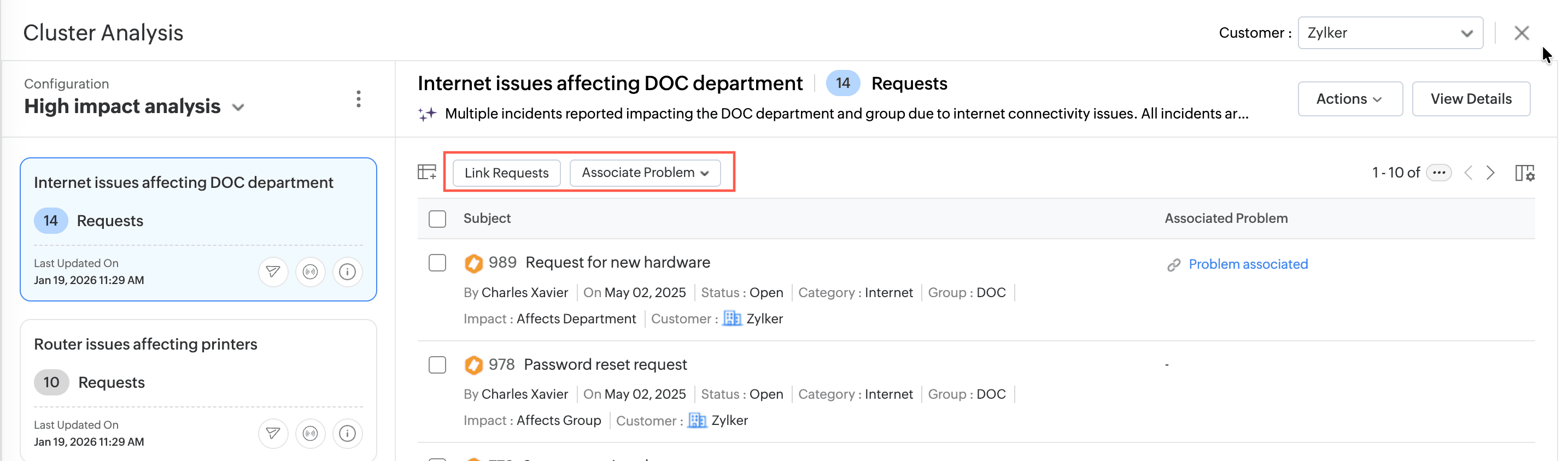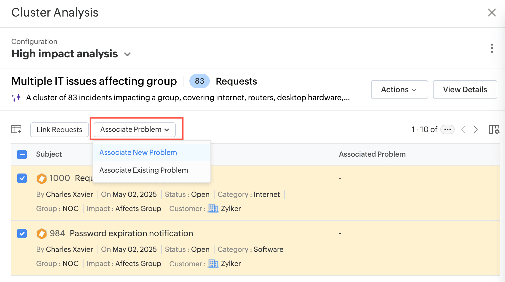 You can associate incident requests in a cluster with a new problem or an existing problem for better root cause management.