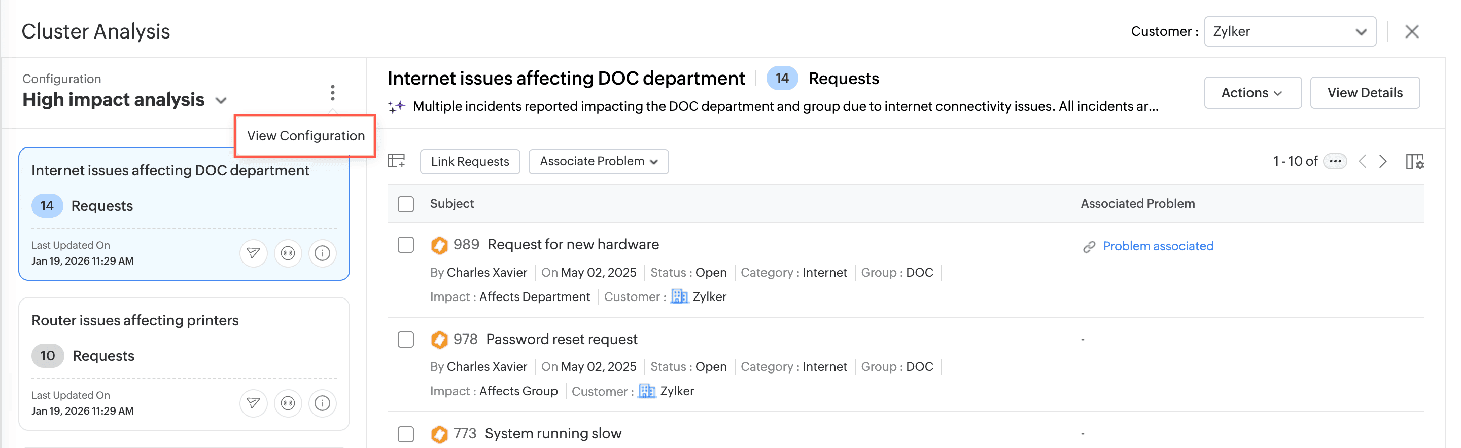 Each configuration groups incident requests into clusters based on the filters and fields defined during setup. You can select a cluster from the left pane to view associated incidents.